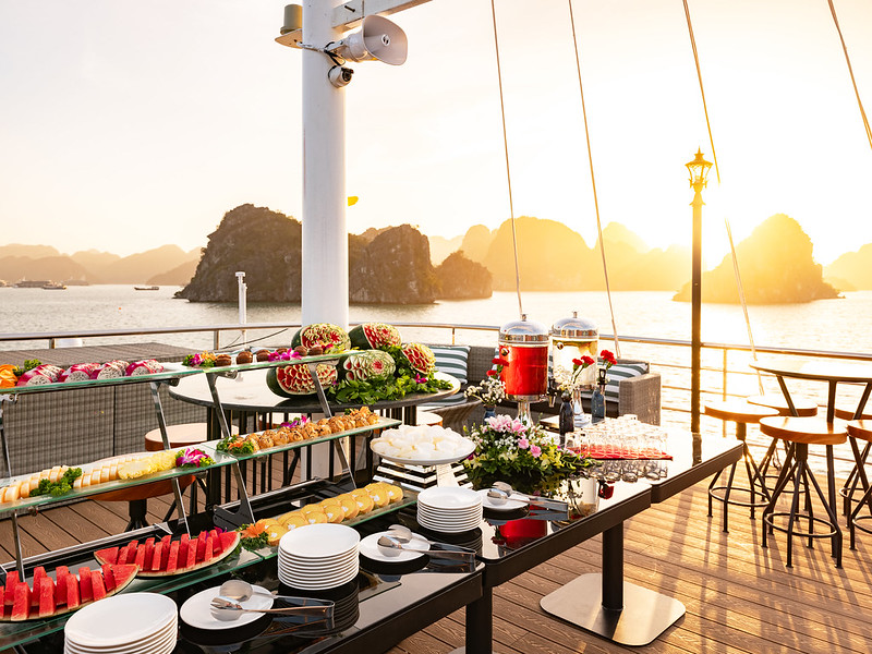 17:30 – 18:30: Quý khách quay lại du thuyền để tự do giải trí, ngắm hoàng hôn, bể bơi ngoài trời và thưởng thức trà chiều, trái cây tươi.